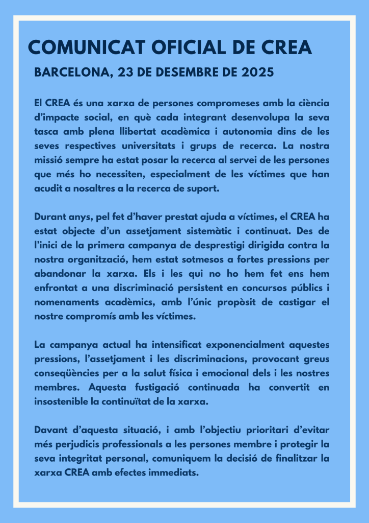 Comunicat oficial del CREA. Barcelona, 23 de desembre del 2025